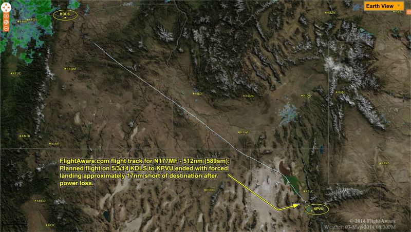 N177MF - Flightaware flight track - Forced landing after power loss on flight from KDLS to KPVU - 17 nm short of destination, after 512nm of flightClick image for full 2868 x 1622 resolution