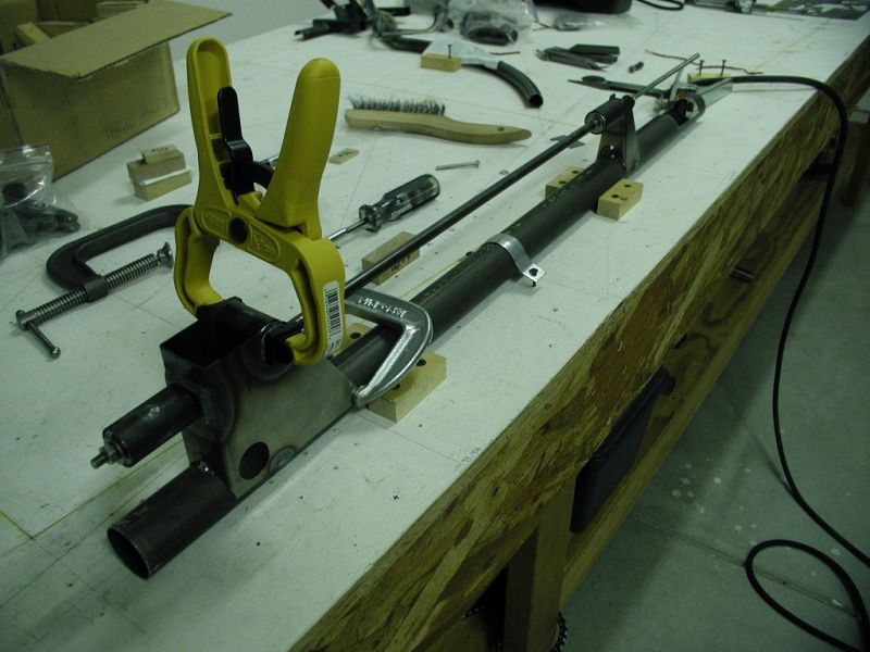 4Q01 - Forward stick tower and aft bearing tower in position to be tack welded. Rod with threaded rod through bearing cages ensure the beaetings will stay aligned when welding.Click image for full 1024 x 768 resolution