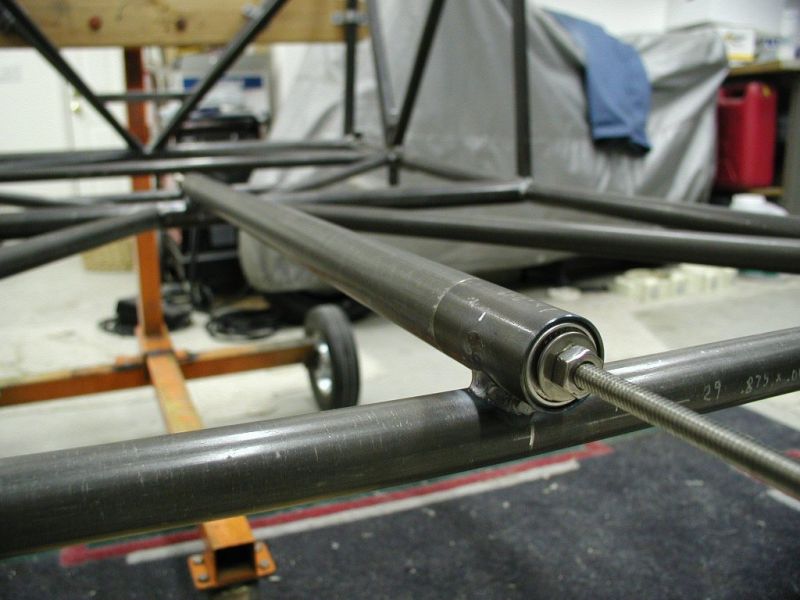 4Q01 - Aft bearing cage for torque tube was already welded to fuselage. Weld plugs and section of tubing bolted between bearing cages keeps the two bearings in alignmentClick image for full 1024 x 768 resolution