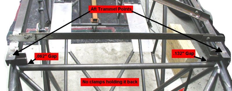 4Q02 - Checking gaps at station 86.0 crossmember with jig trammed and sitting on the fuselage while unclamped.Click image for full 1001 x 394 resolution