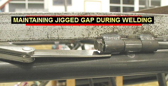 4Q02 - Feeler gages jammed in between jig and fuselage and jig bushing to raise it up slightly, so after tackwelding, the fuselage bushing will be at proper height 550 x 282 - best resolution available