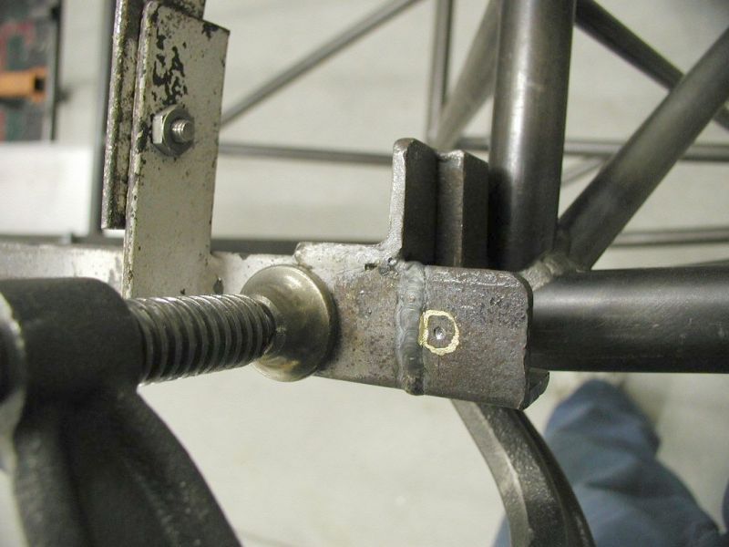 4Q02 - About to do 3rd try tackwelding the bushings with the jig racked right side forward .19 inches, to make windshield posts equal distant from station 0.0 crossmember. Aft left corner of jig shown. Tiny drill marks used to check tram of jig. Click image for full 1024 x 768 resolution