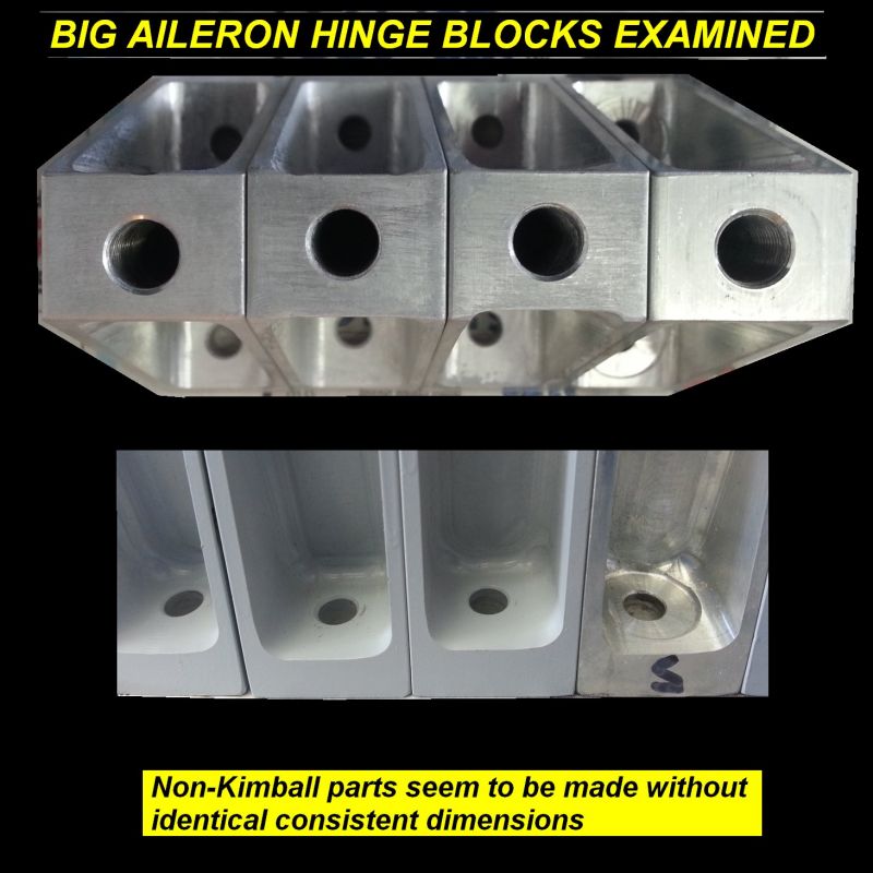 1Q14 - Examination of spar side hinge blocks shows inconsistent manufacture by previous builder I bought wing kit from. ALL NON-KIMBALL AILERON HINGE PARTS WERE REPLACED WITH GENUINE KIMBALL PARTS.Click image for full 1462 x 1462 resolution