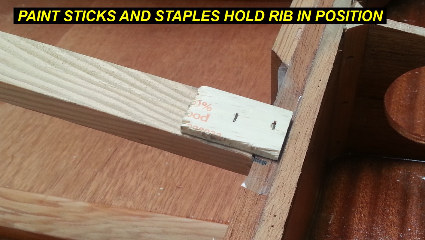 2Q14 - Short sections of paint stir sticks are stapled to keep rib in position and flush with top of spar surfaceClick image for full 1415 x 798 resolution