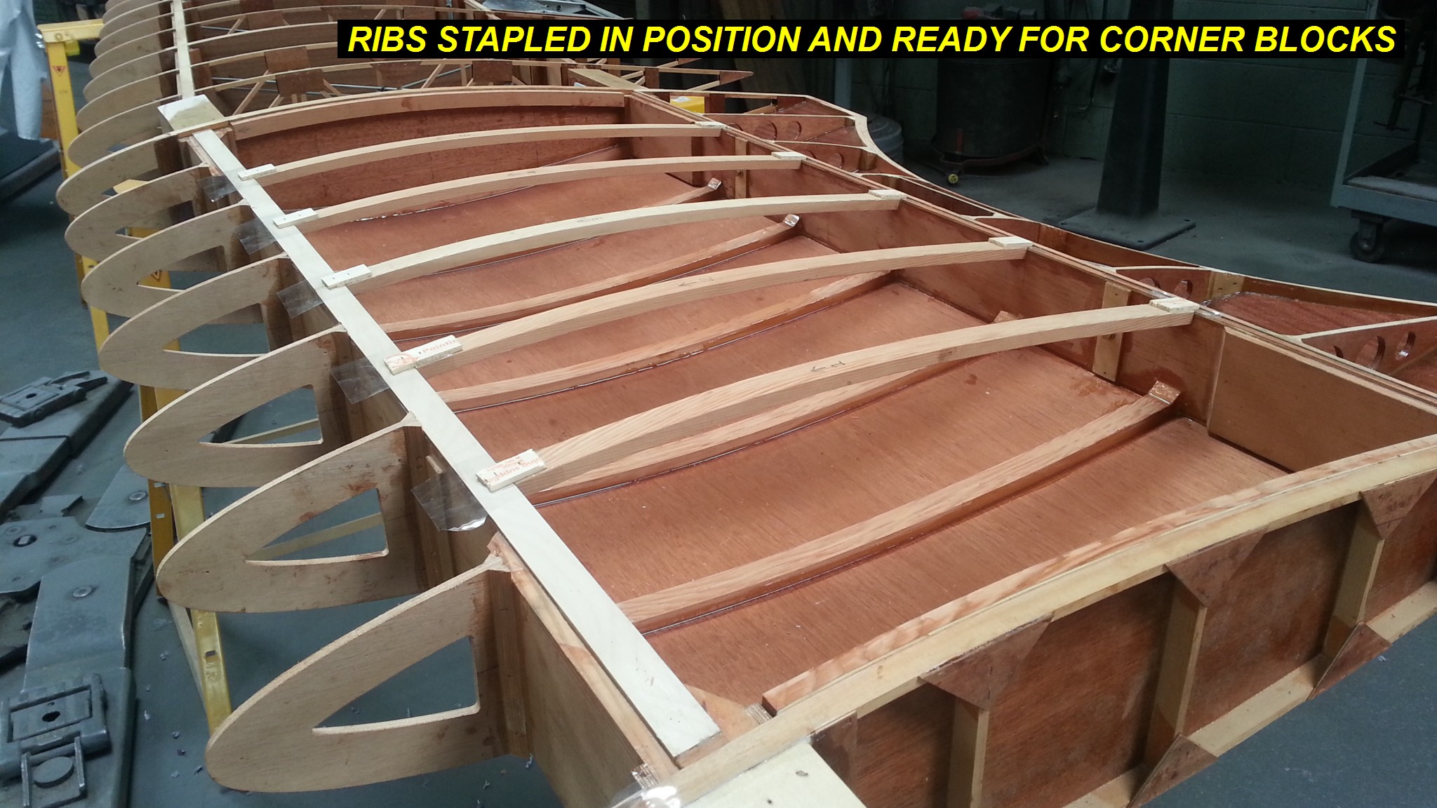 2Q14 - All the ribs are now taped and stapled in position for gluing of the -17 corner blocks. I will flip the wing upside down for gluing so the blocks stay on position while glue cures.Click image for full 2048 x 1152 resolution