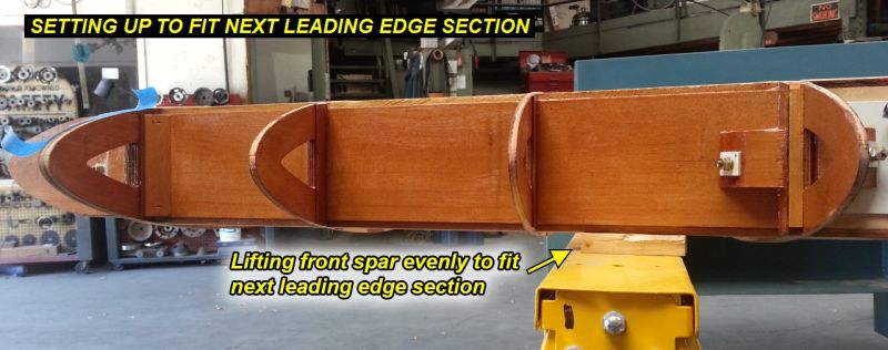 3Q14 - Block under front spar lifts it up and allows next section of leading edge to be fitted without hitting the sawhorseClick image for full 1280 x 507 resolution