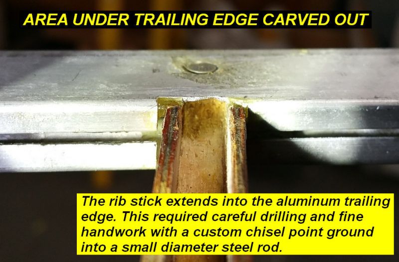 2Q15 - The rib stick extends into the aluminum trailing edge. This required careful drilling and fine handwork with a custom chisel point ground into a small diameter steel rod.Click image for full 935 x 615 resolution