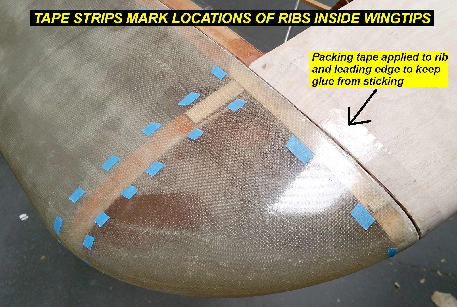 2Q15 - Used tape strips to mark locations of ribs insdie wingtips for applicaton of glue and Awl-Fair laterClick image for full 1590 x 1068 resolution