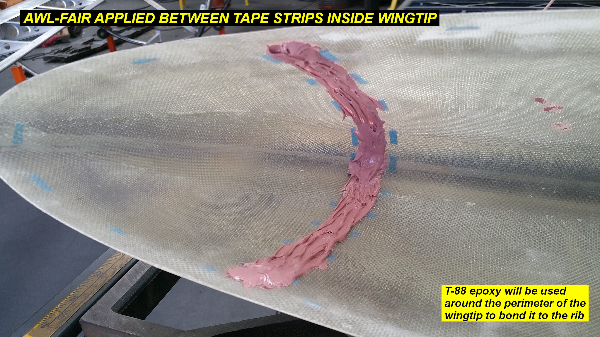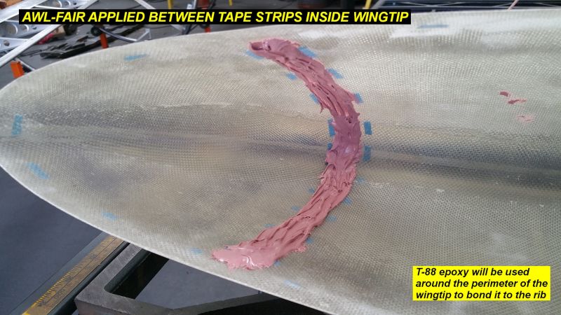 2Q15 - Awlfair applied between tape strips inside wingtip, T-88 epoxy will be applied around the edge to glue it to the ribClick image for full 2048 x 1152 resolution