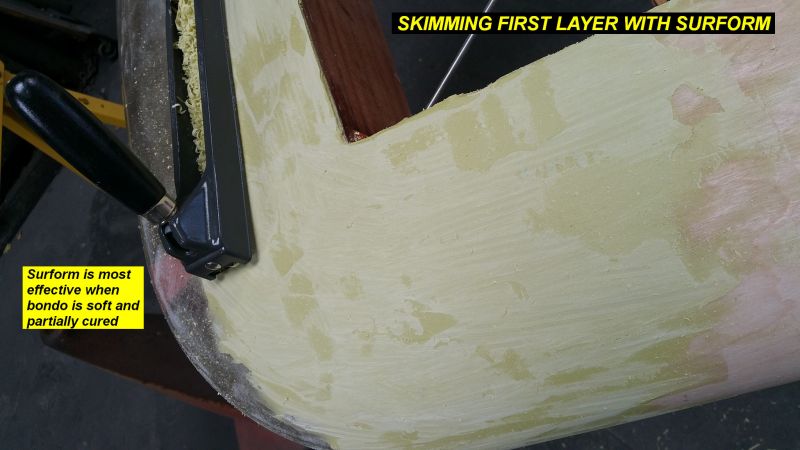 3Q15 - Rough skimming the first layer with the surform. This is only effective while the bondo is soft and partially curedClick image for full 2048 x 1152 resolution